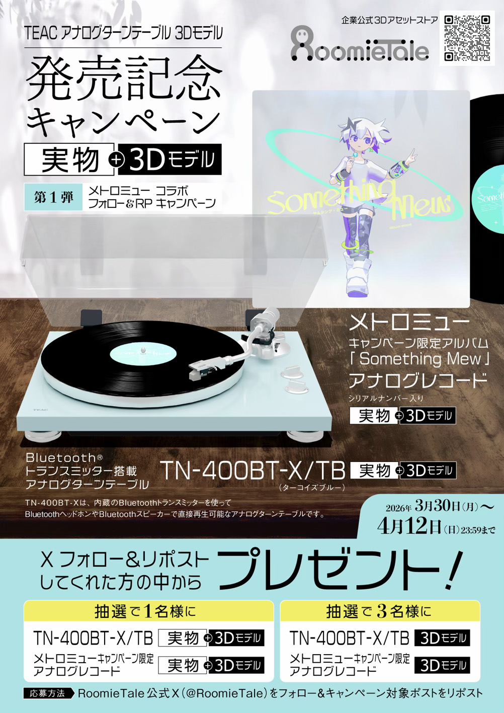 ティアック株式会社(本社:東京都、以下「ティアック」)は、当社のBluetooth®トランスミッター搭載アナログターンテーブル「TN-400BT-X」を3Dデータ化し、株式会社オカムラ(本社:神奈川県横浜市、代表取締役 社長執行役員:中村 雅行)が運営するメタバース用の企業公式3Dデータ販売サイト「RoomieTale(ルーミーテイル)」において、3月30日(月)より販売を開始いたします。